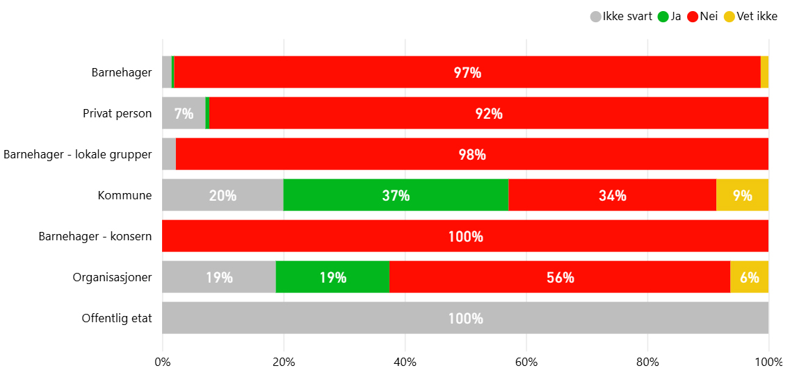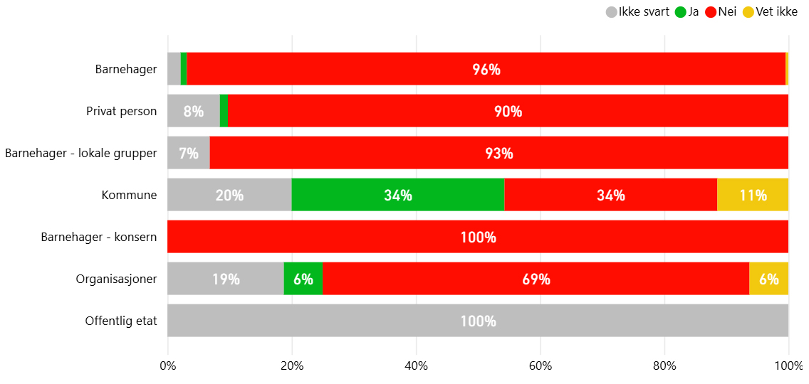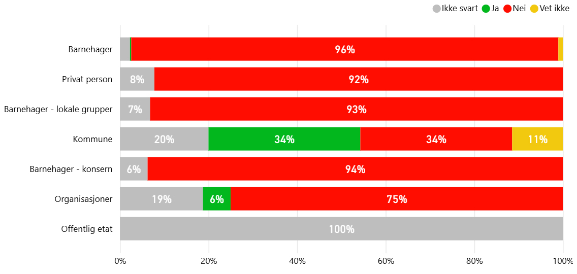 Andelen svar merket rødt indikerer at høringsinstansene sier nei til deparmtentets forslag. Andelen grønt og gult viser til høringsinstanser som svarer henholdsvis "ja" og "vet ikke". De som er merket grått, har ikke krysset av for noe svar, men kan ha gitt uttrykk for sin mening gjennom fritekstsvar.