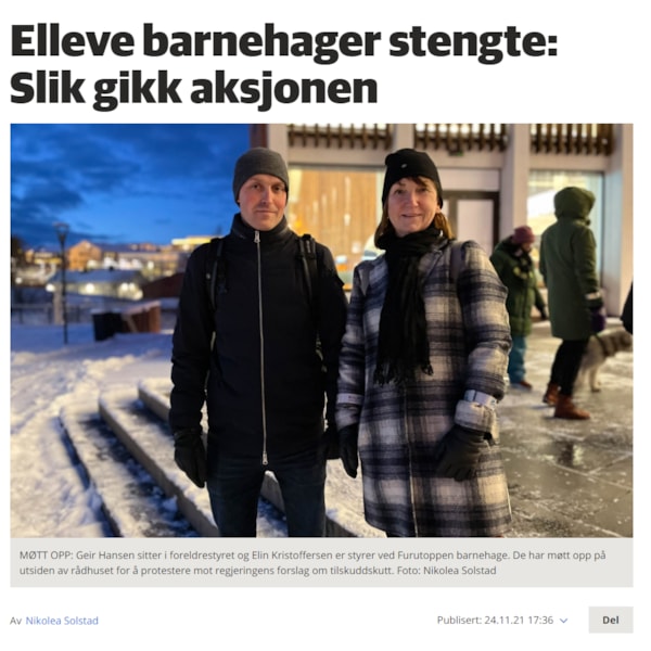 – Det tar vi på alvor. Og ikke minst er det beklagelig at foreldrene fikk lite tid til å forberede seg. Men vi mente det var nødvendig å aksjonere raskt for å få mest mulig oppmerksomhet om saken nå som forhandlingene om statsbudsjettet pågår, sier Eirik Husby.